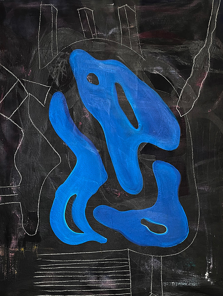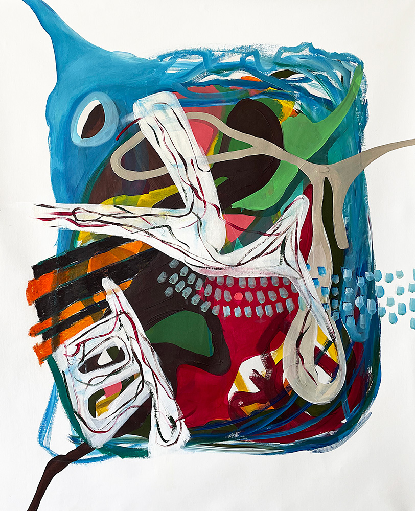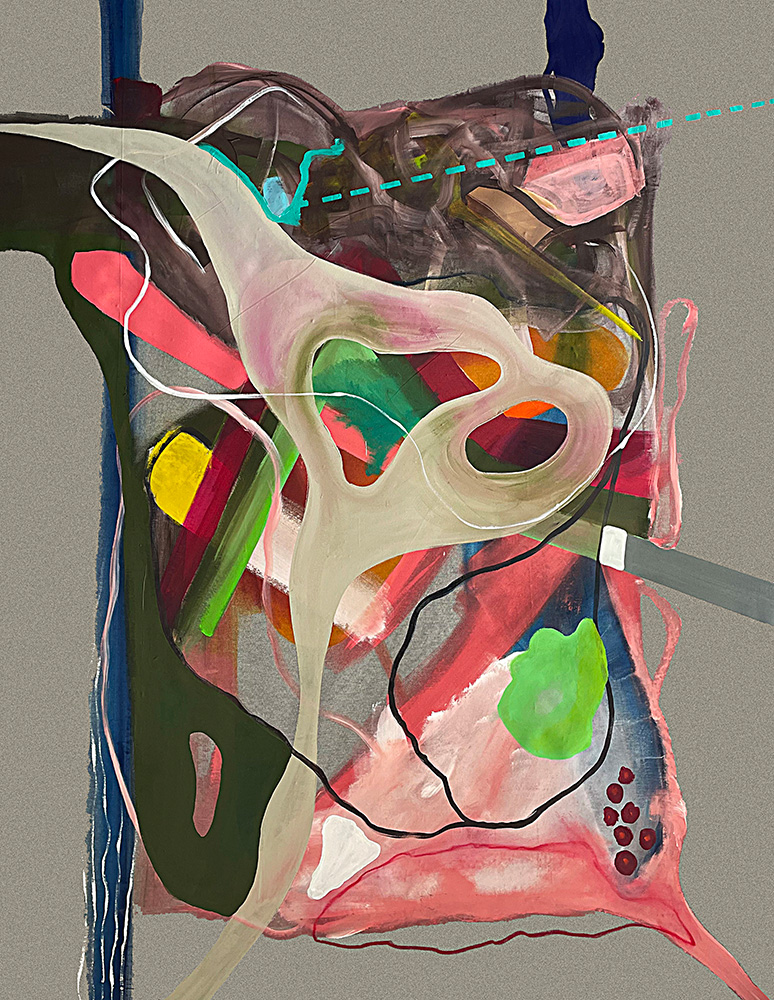 Es mediante la presencia del color, combinado con una abstracción por momentos con tintes expresionistas y otras tantas surrealistas, donde la obra, se expande en formatos y soportes diversos, (acrílicos, óleos, pasteles, carbonilla, pintura asfáltica, esmalte sintético, sobre tela, papel, madera y acero) transitando materialidades mixtas que se superponen aplastando las aparentes figuras contra fondos heterogéneos.